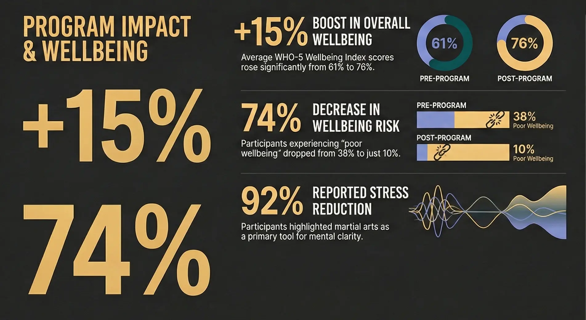 Using the WHO-5 Well-Being Index, participants showed remarkable progress. Average wellbeing scores increased from 61% to 76%—a 15-percentage-point improvement that exceeded our 10-point target. Even more striking, the proportion of participants experiencing poor wellbeing dropped dramatically from 38% to just 10%.